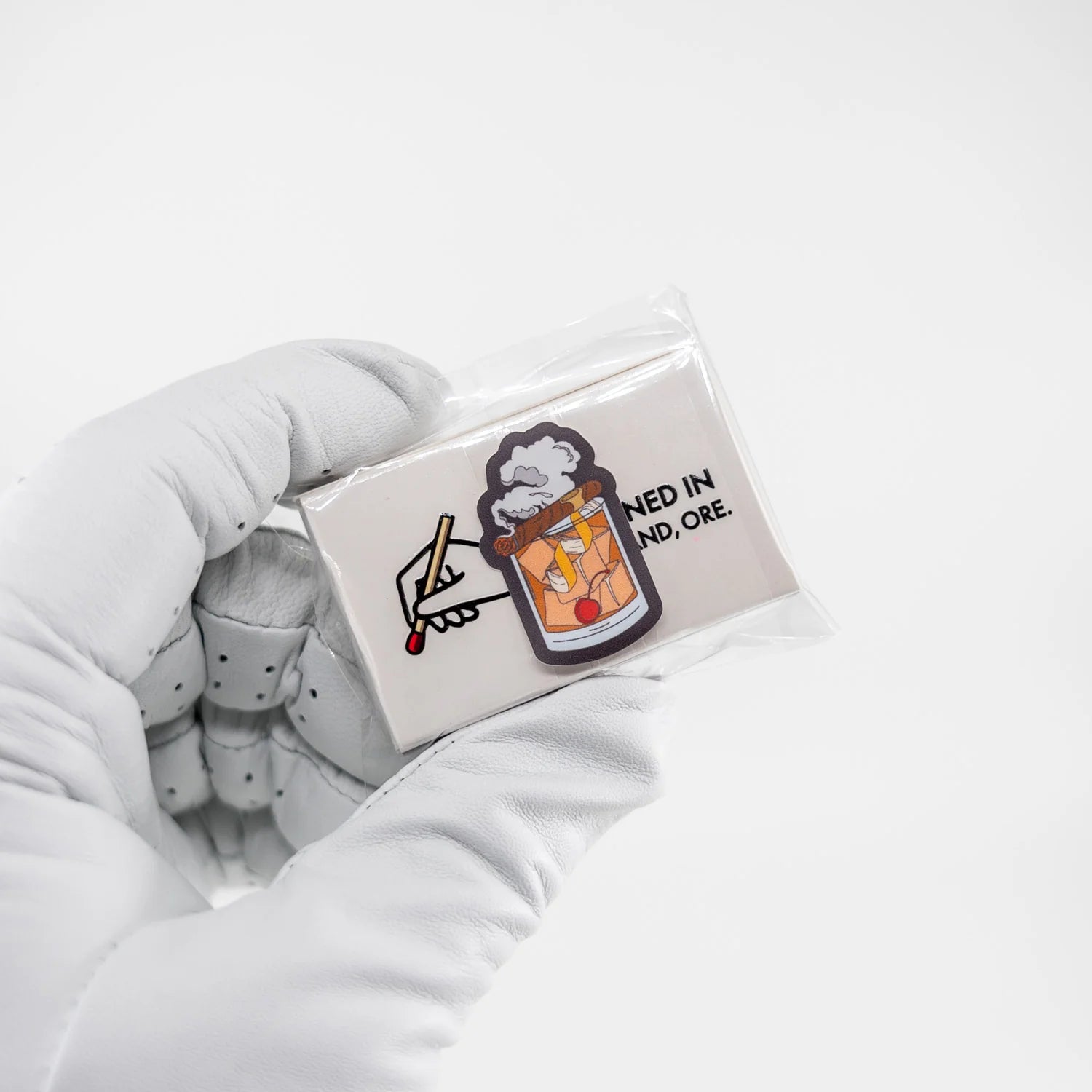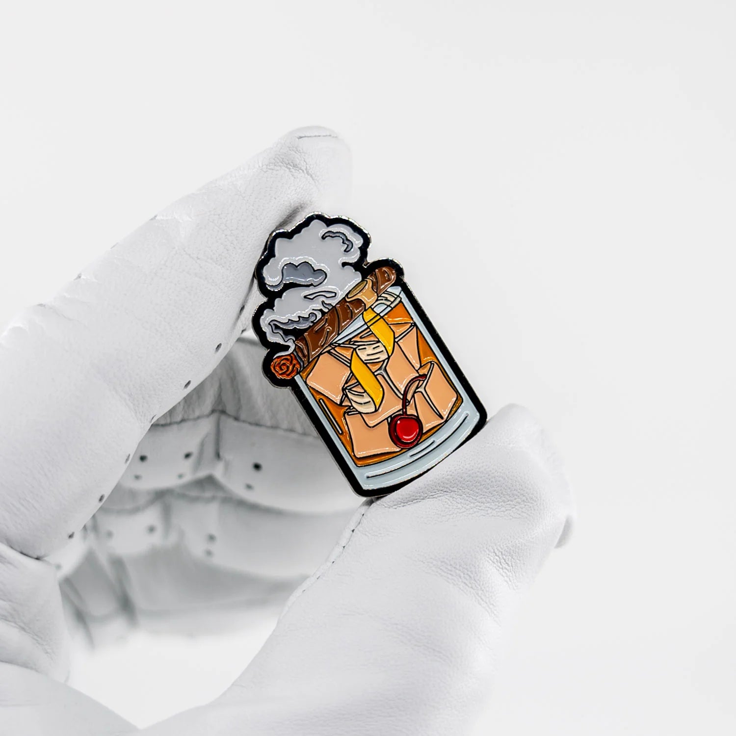 OLD FASHIONED GOLF BALL MARKER is the perfect companion for anyone who appreciates relaxing with a refreshing drink and a good cigar after a round of golf. This golf ball marker combines one of the most iconic cocktails with the smooth taste that many golfers enjoy on the patio of their local club. The design highlights an orange peel spiral and a maraschino cherry in the center, surrounded by thick ice cubes and a smoking cigar on top.