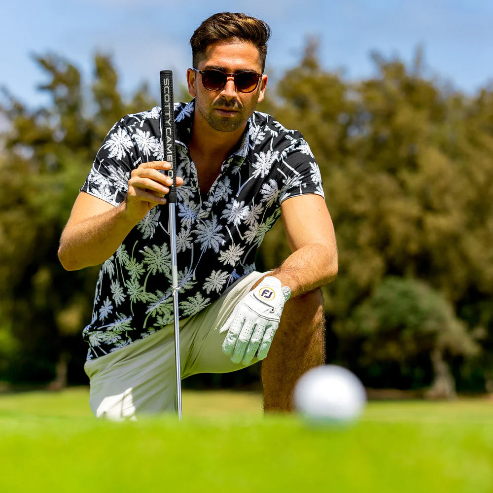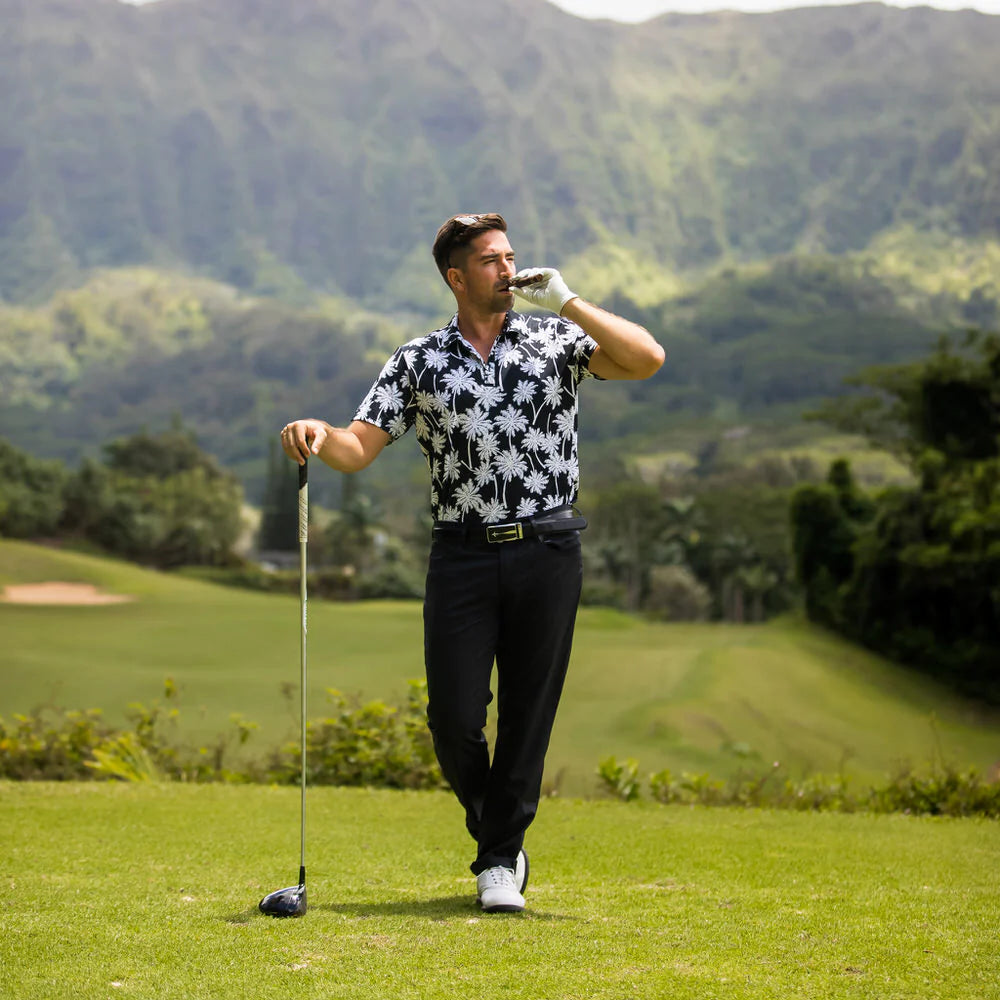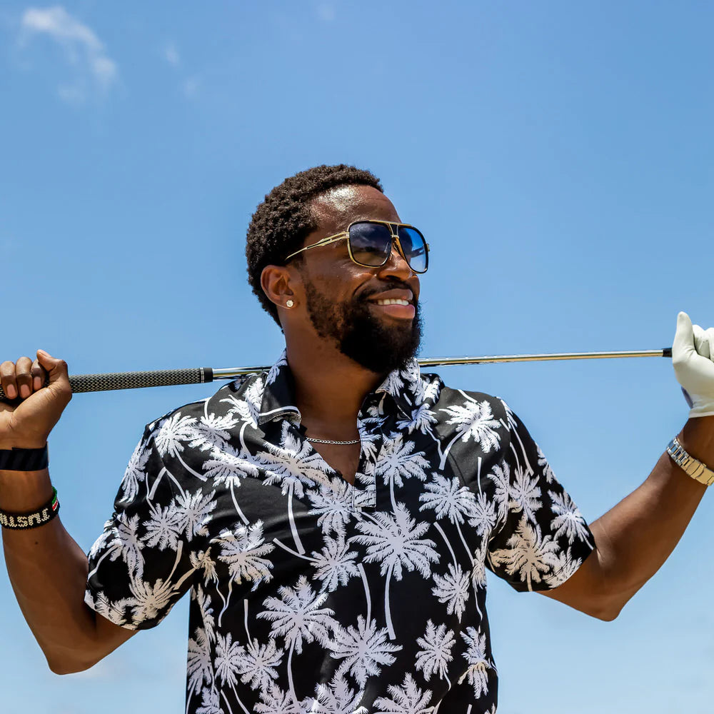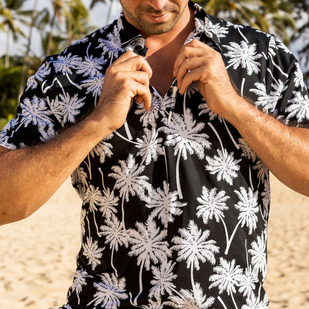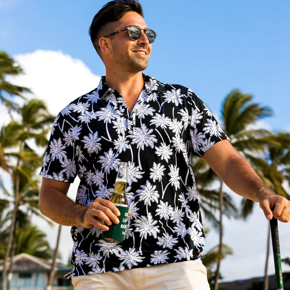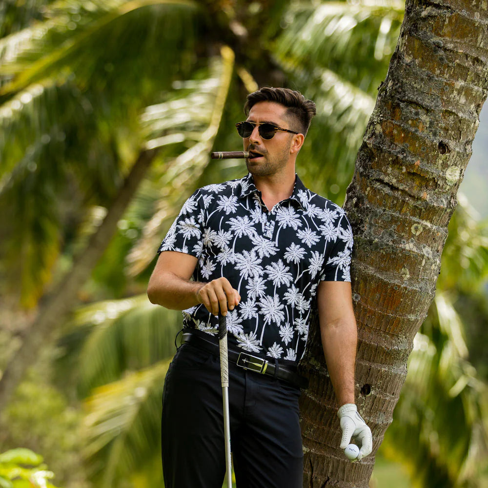 En sofistikerad golftröja med svartvita palmer som tryck.